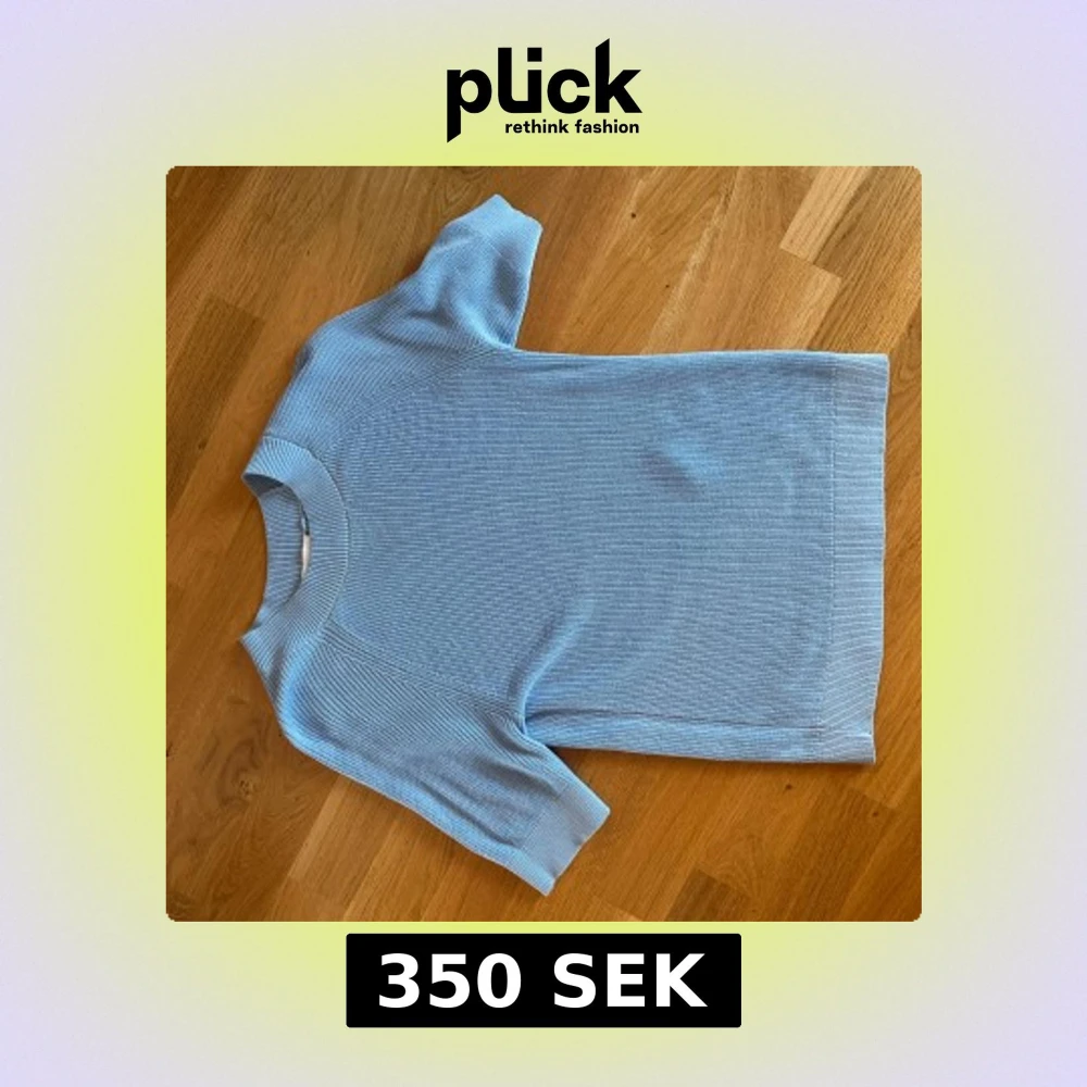 Snygg ljusblå stickad tröja med korta ärmar och rund hals. Tröjan har en ribbad struktur på ärmarna och runt halsen, vilket ger en cool och modern känsla. Perfekt att matcha med jeans eller kjol för en fräsch look.