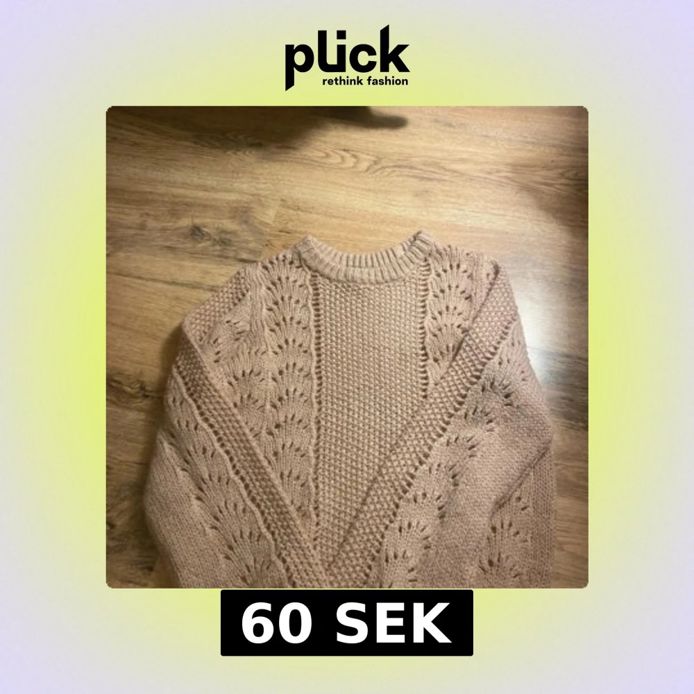 Säljer en beige stickad tröja med snyggt hålmönster längs ärmar och framstycke. Tröjan har rund halsringning och långärmade ärmar. Perfekt för dig som gillar en mysig och trendig look under kyliga dagar.