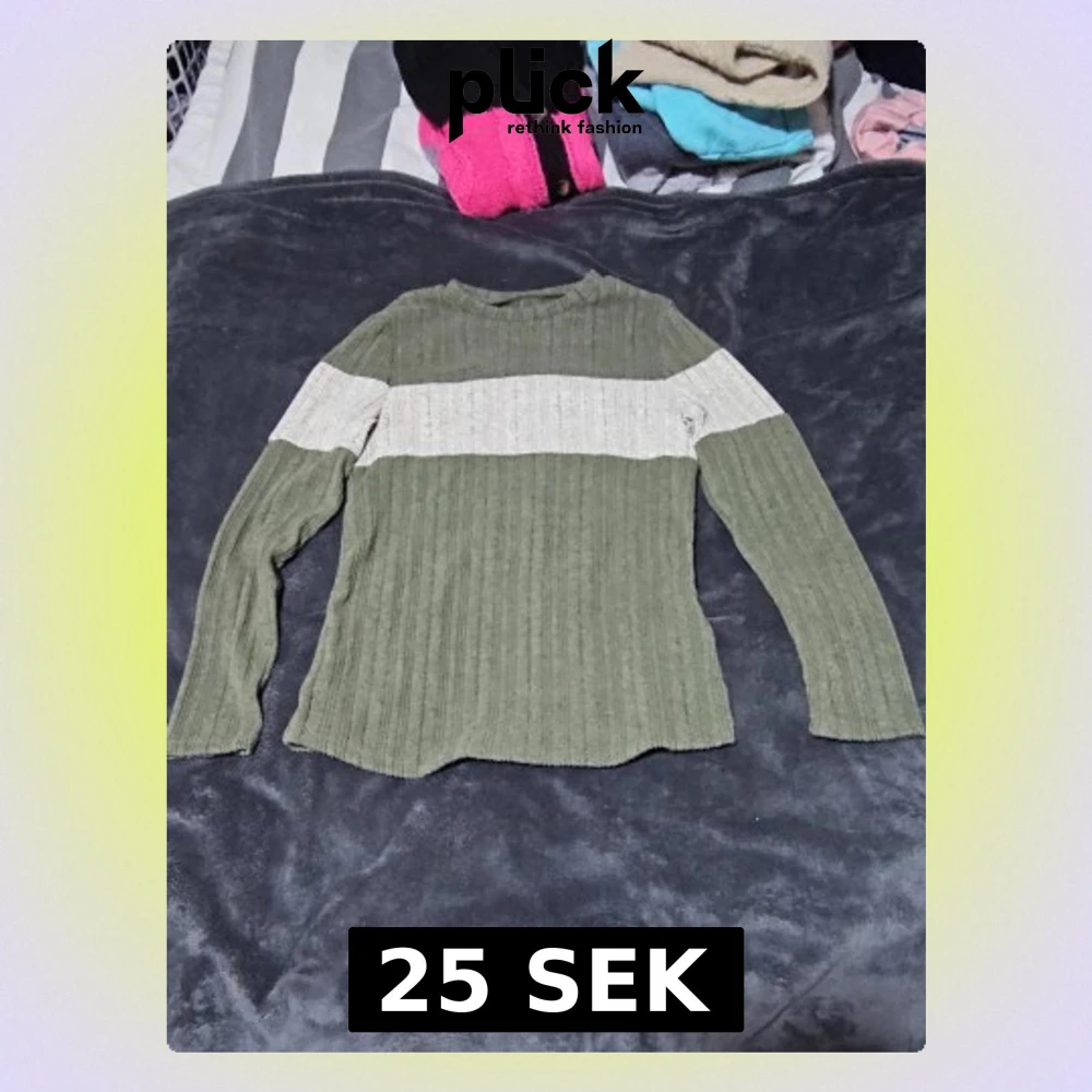 Olivgrön långärmad tröja från SHEIN i storlek S, med bred vit rand över bröstet och armarna. Tröjan är ribbad och har en rund hals. Materialet är mjuk polyester med lite stretch för skön passform. Perfekt för dig som gillar enkel men snygg stil. Aldrig använd