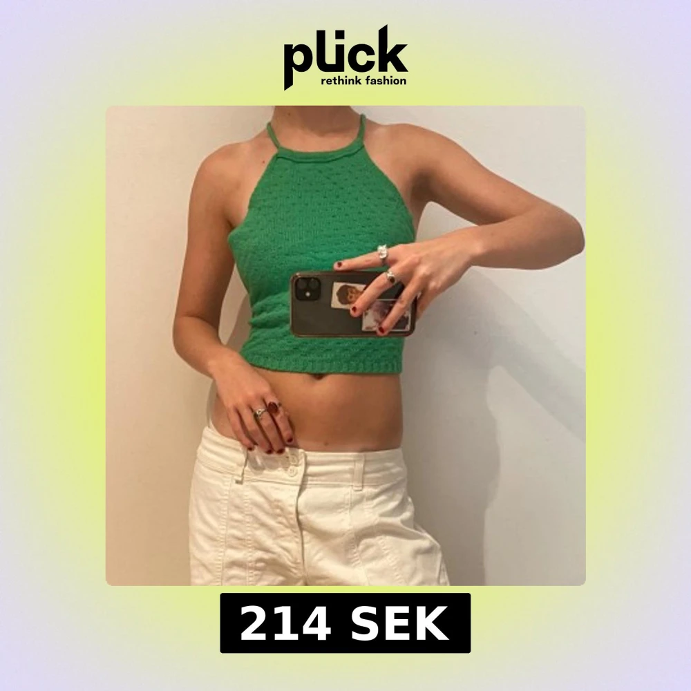 Säljer en grön stickad linnetopp med smala axelband och croppad passform. Toppen har en halterneck-skärning som ger en snygg och trendig look. Perfekt för varma dagar och enkel att styla med jeans eller kjol.