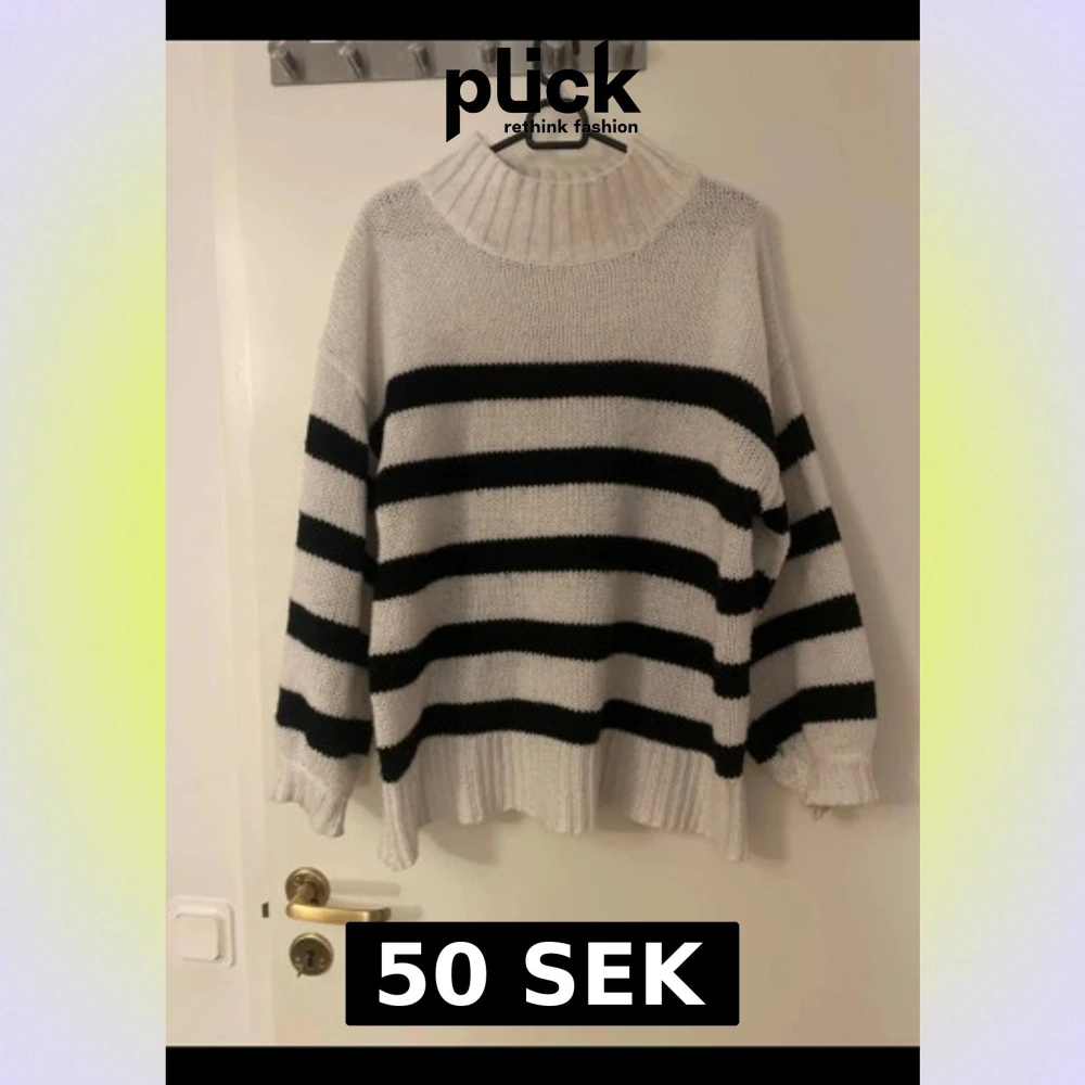 Säljer en oversized stickad polotröja med breda svarta och vita ränder. Tröjan har halv hög ribbad krage, långa ärmar och ribbade muddar. Perfekt för dig som gillar en chill och trendig look under höst och vinter.