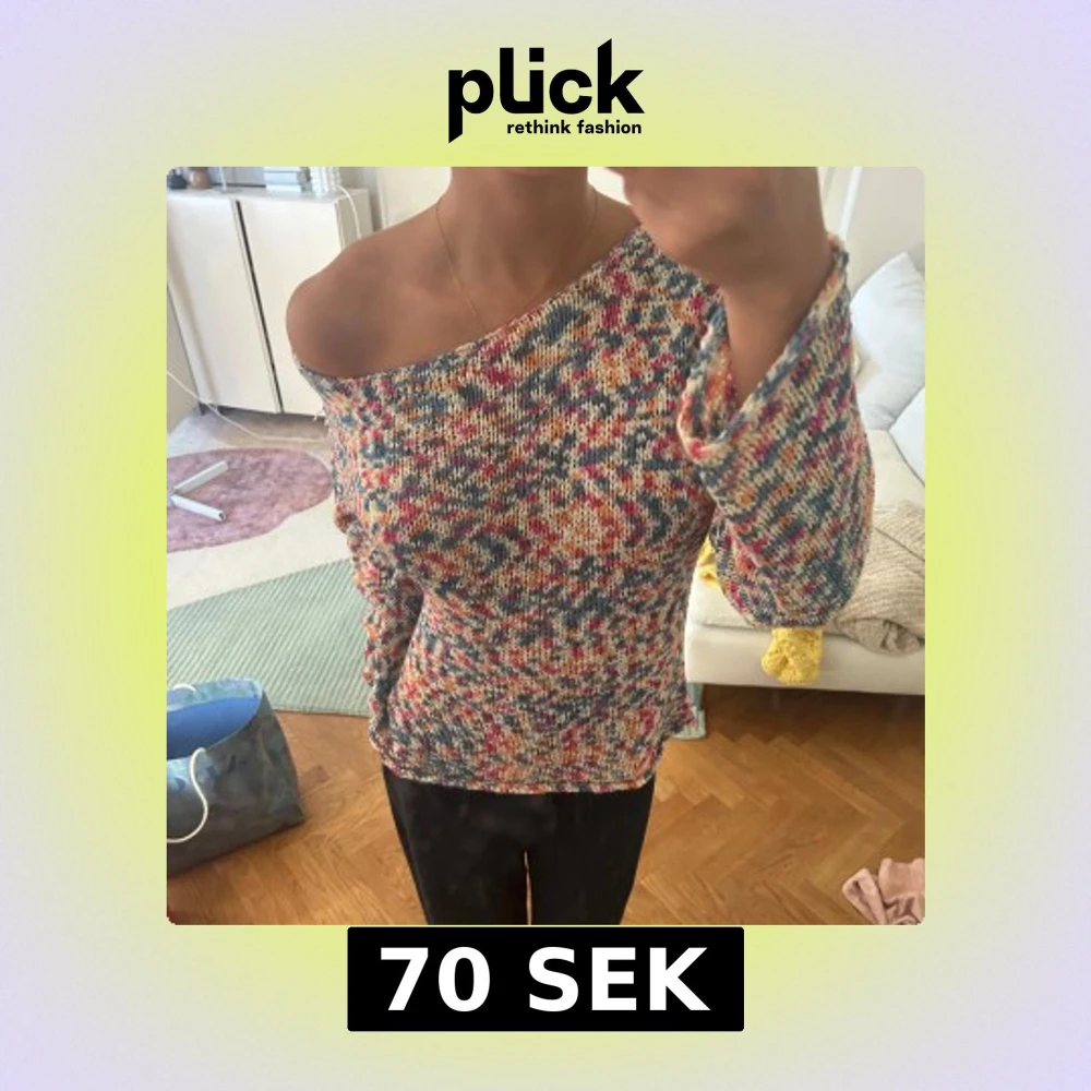 Säljer en stickad tröja med offshoulder-modell i flera färger som blått, rött, gult och beige. Tröjan har lång ärm och en loose passform, perfekt för dig som gillar en avslappnad och trendig stil. Mönstret är småprickigt och ger en cool, färgsprakande look.