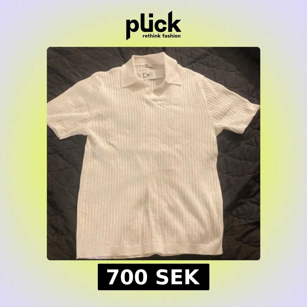 Säljer en stilren vit stickad pikétröja med klassisk krage och korta ärmar. Tröjan har ett diskret ribbat mönster som ger en snygg struktur. Perfekt för en clean och fräsch look.