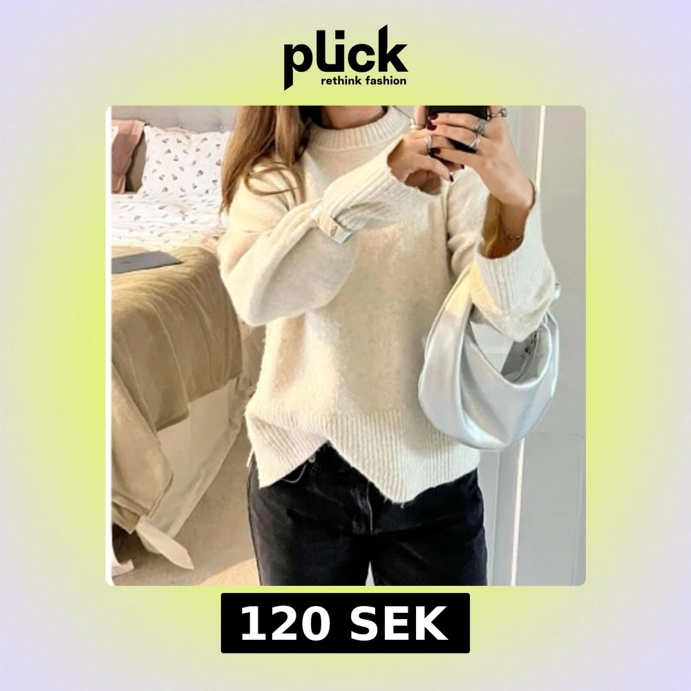 Säljer en mysig vit stickad tröja med långa ärmar och ribbade detaljer vid ärmslut och nederkant. Perfekt för kyliga dagar och en stilren look💕