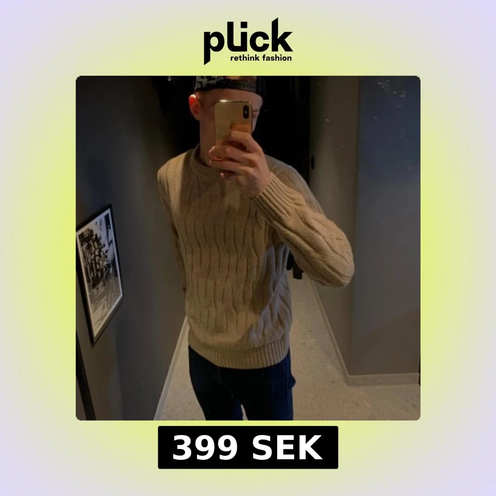 Säljer en stilren beige stickad tröja från Bläck. Tröjan har ett klassiskt flätmönster och ärmar med ribbade muddar.