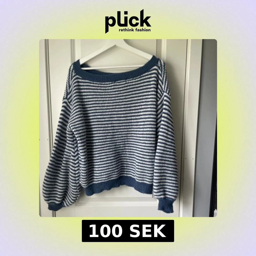 Säljer en mysig stickad tröja med blå och vita ränder. Tröjan har en lös passform, rund halsringning och långa ärmar❣️