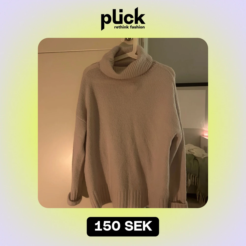 Mysig beige/rosa stickad polotröja från 157 i storlek S. Har en hög krage och långa ärmar. Tröjan har en avslappnad passform och ribbade muddar vid ärmslut och nederkant. Använd fåtal gånger