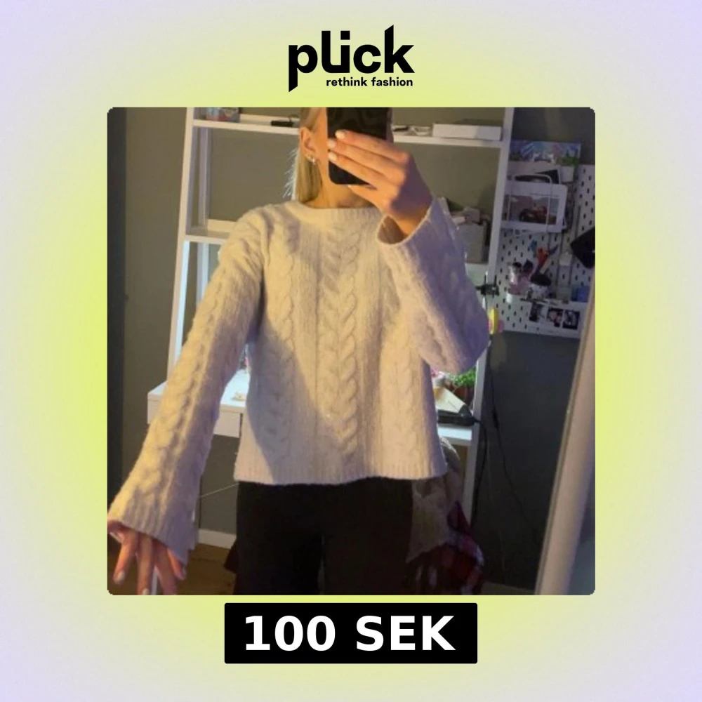 Säljer en mysig vit stickad tröja med flätmönster. Tröjan har långa ärmar och är väldigt gosig. Använd sparsamt