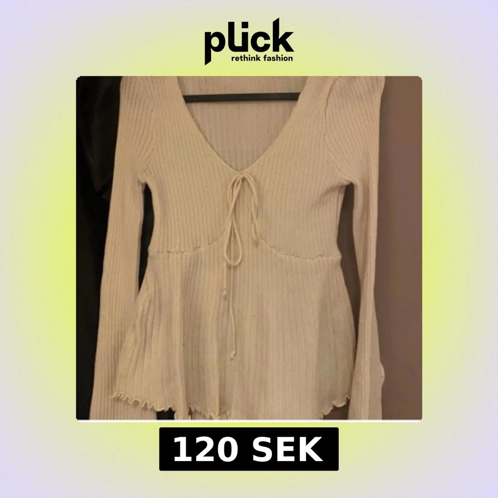 Superfin beige stickad tröja med ribbat tyg, v-ringning och knyt framtill. Långa ärmar och volangkant nertill ger en söt och trendig look. Perfekt att styla med jeans eller kjol för en chill vibe.