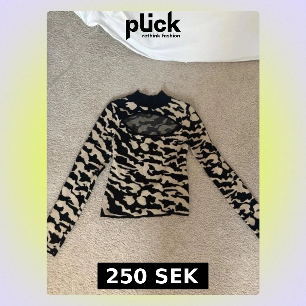 Säljer en cool långärmad stickad tröja med svart och beige zebramönster. Tröjan har en hög krage och en unik meshdetalj över bröstet som ger en edgy vibe. Perfekt för dig som vill sticka ut med din stil.