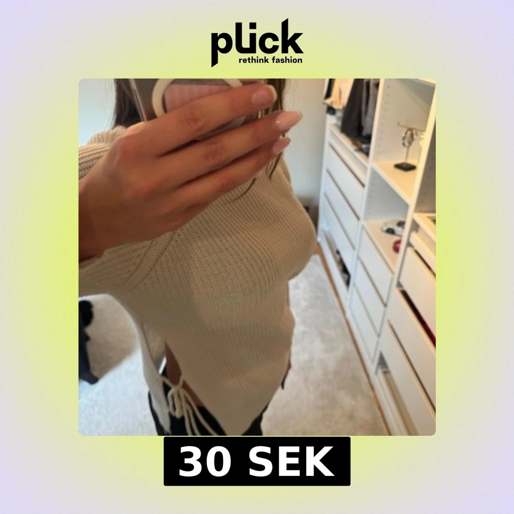 Säljer en vit stickad tröja med långa ärmar. Tröjan har snygga snörningsdetaljer i sidorna.
