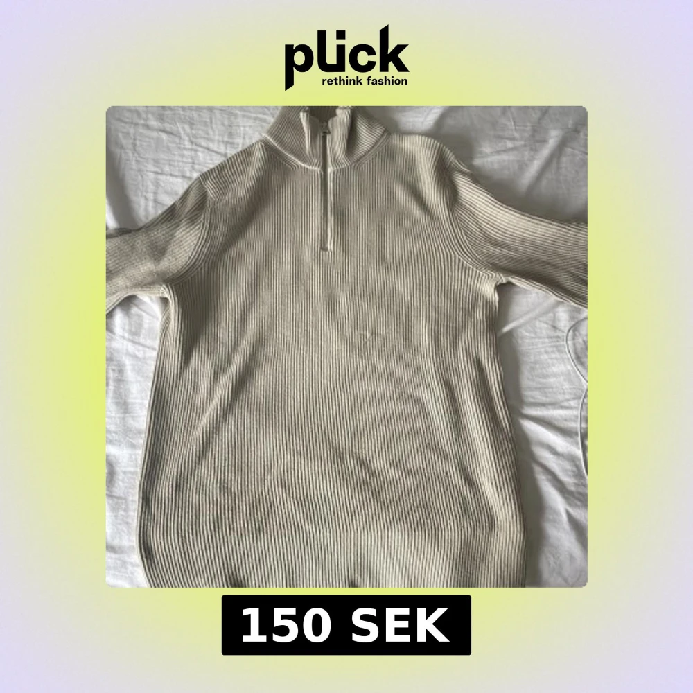 Säljer en beige ribbad stickad tröja från Jacquemus med halv dragkedja och hög krage. Perfekt för lager-på-lager och har en stilren, minimalistisk look. Passar både till jeans och kjol.