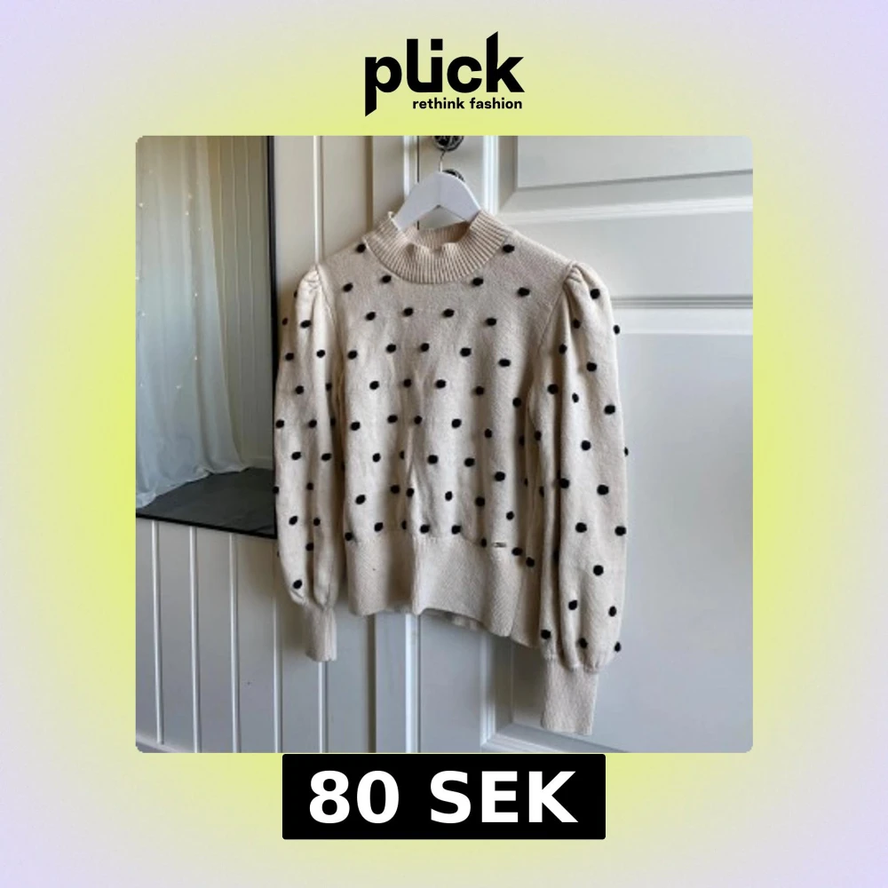 Superfin beige stickad tröja med svarta prickar och puffiga långärmar. Hög ribbad halsringning och breda muddar ger en trendig look. Perfekt för dig som gillar lekfulla detaljer.