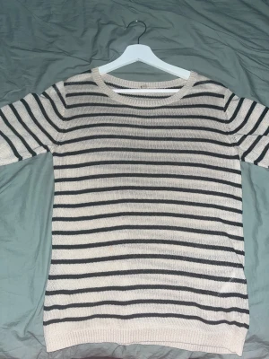 Beige och svart randig stickad tröja från Soyaconcept. Tröjan har rund halsringning, korta ärmar och är i ett mjukt stickat material. Perfekt för dig som gillar en avslappnad men ändå stilren look.