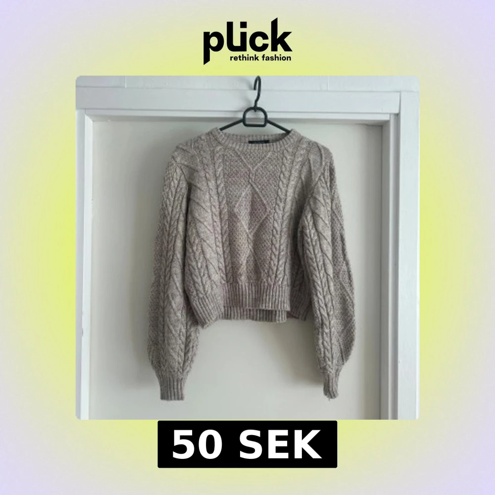 Snygg beige stickad tröja med grovt flätmönster och ribbade muddar. Modellen är lite croppad och har långärmade, något puffiga ärmar. Perfekt för dig som gillar en chill och trendig look under höst och vinter.