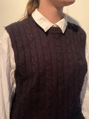 Mörkbrun ärmlös stickad tröja - Säljer en mörkbrun, ärmlös stickad tröja med lite högre hals. Aldrig använd och prislapp kvar.
