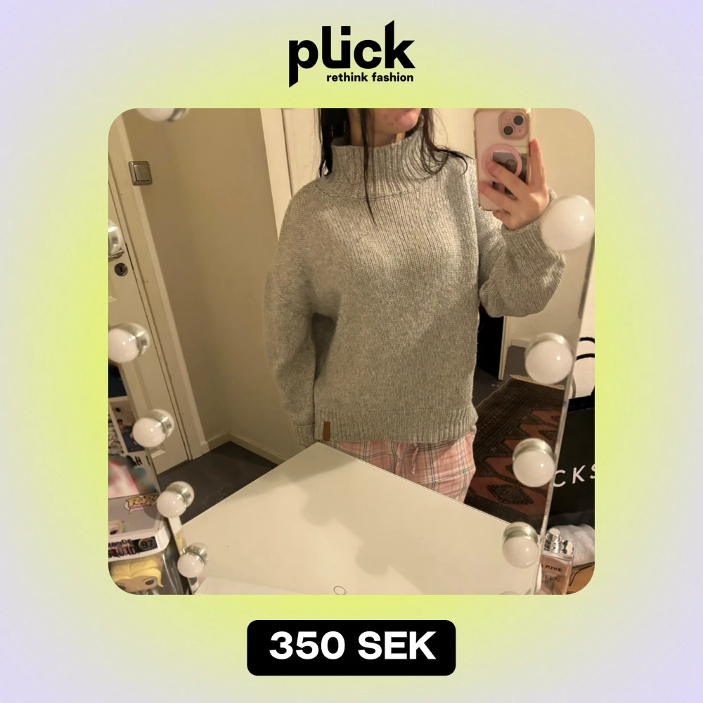 Mysig grå stickad polotröja perfekt för kyliga dagar. Den har en hög krage och långa ärmar, vilket gör den superbekväm och varm. Tröjan är i bra skick och passar perfekt för både höst och vinter. Enkelt att matcha med olika outfits!
