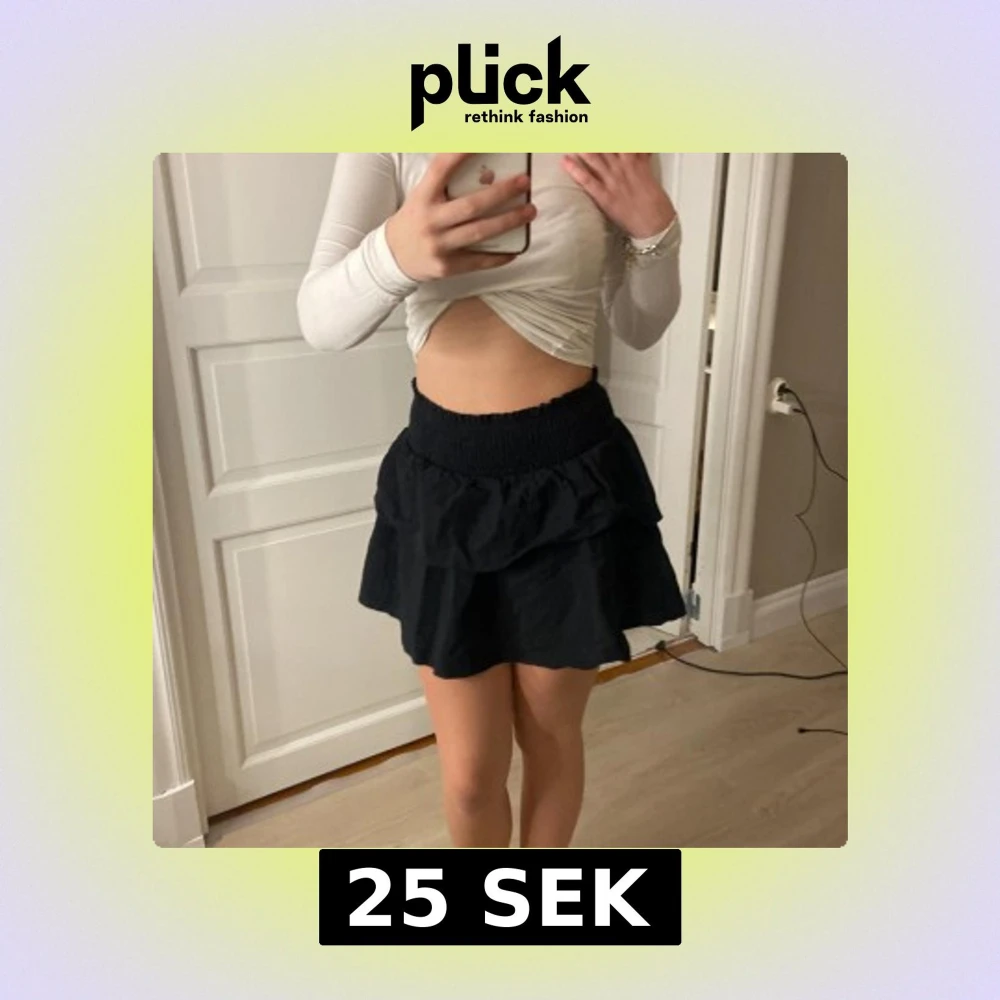 Supersöt svart kortkjol med bred smockresår i midjan och dubbla volanger som ger en riktigt fin och flowy look. Perfekt att styla med crop top eller stickad tröja. Kjolen är lätt och skön att bära.