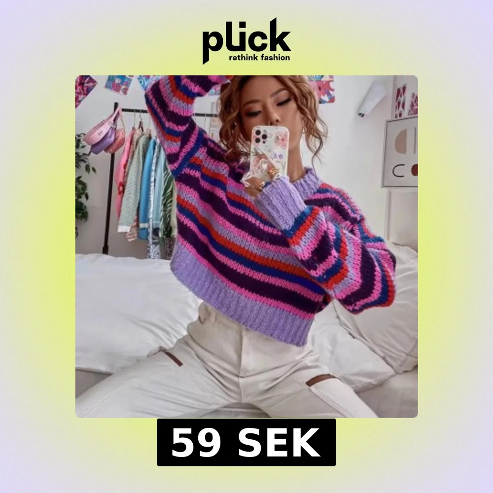 Superfin croppad stickad tröja med breda ränder i lila, rosa, röd, blå och mörklila. Tröjan har lång ärm, ribbade muddar och en relaxed fit. Perfekt för dig som gillar färg och vill sticka ut lite extra.