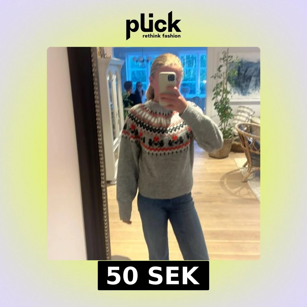 Supermysig grå stickad tröja med klassiskt mönster i svart, vitt och rött över bröst och axlar. Tröjan har rund hals och långa ärmar, perfekt för kalla dagar. Snygg till jeans eller kjol för en chill look.Den är i storlek S men sitter som Xs.