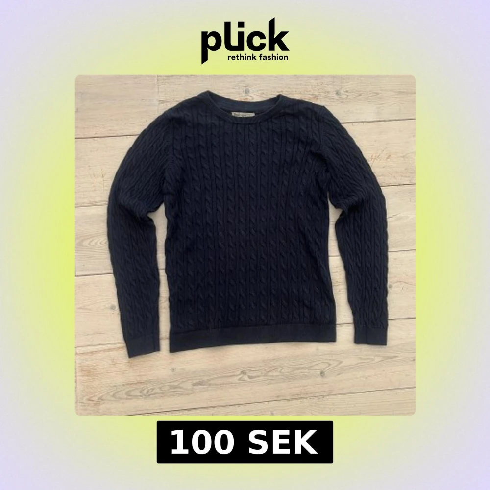 Kabelstickad tröja i mörkblått från Basic You. Gjord i ekologisk bomull, med rund halsringning och långa ärmar.