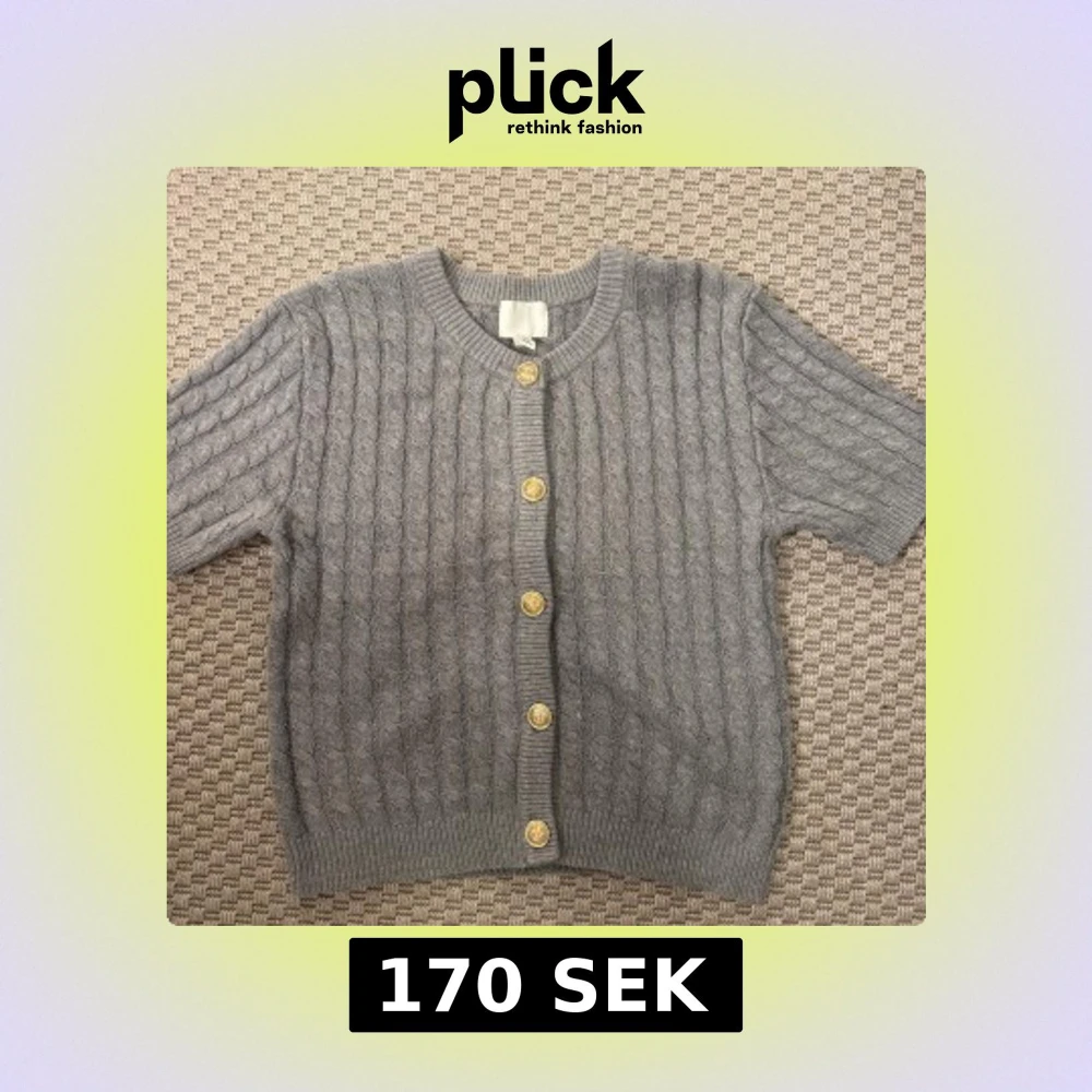 Aldrig använt. Snygg grå kabelstickad kofta med korta ärmar och dekorativa guldknappar framtill. Perfekt för lager-på-lager och ger en klassisk touch till din outfit. Ribbstickade muddar vid ärmslut och nederkant.
