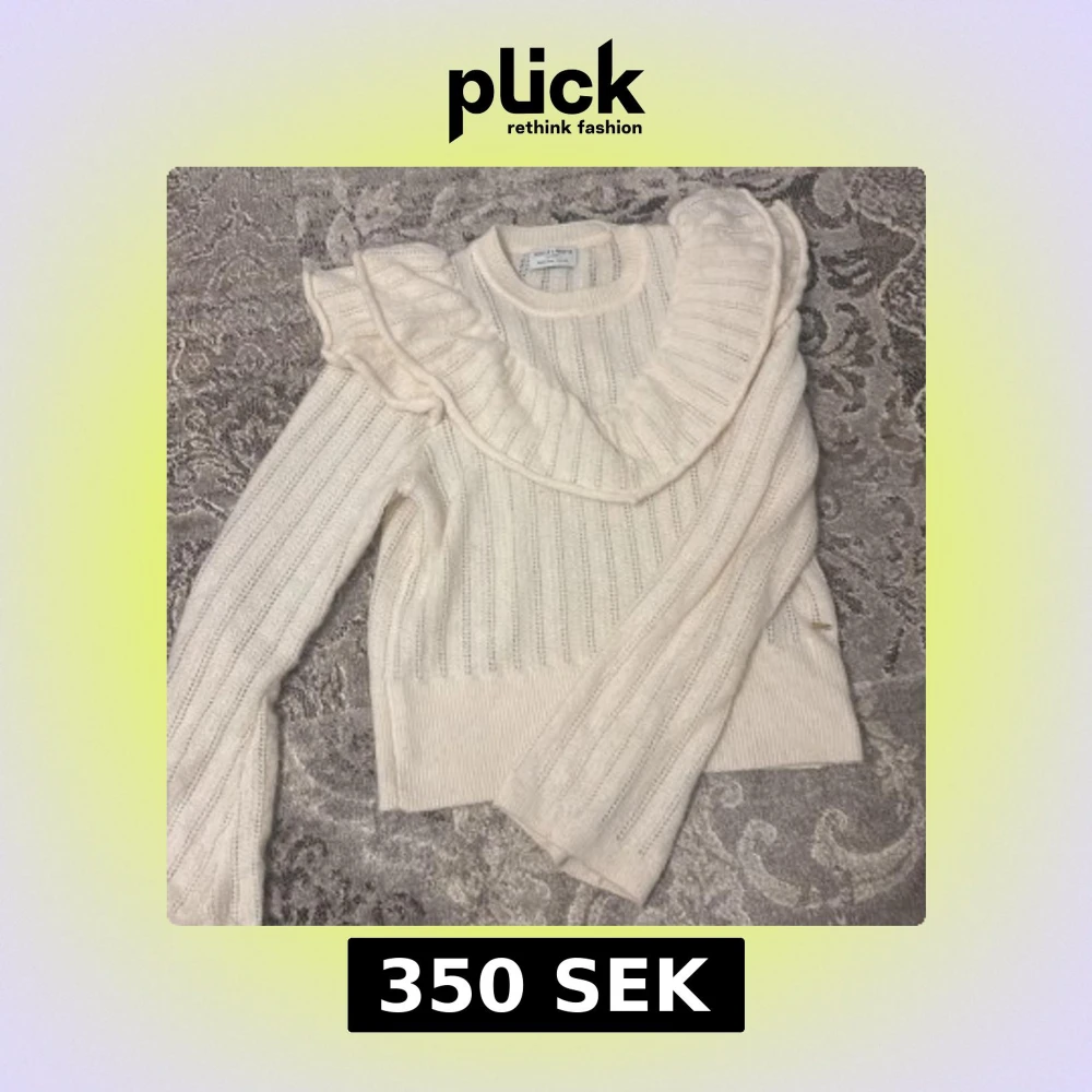 Säljer en söt vit stickad tröja från Holly & White med volangdetaljer på axlarna. Tröjan har ett ribbat mönster och långa ärmar, perfekt för kyligare dagar. Passar bra till både jeans och kjol. 🧡