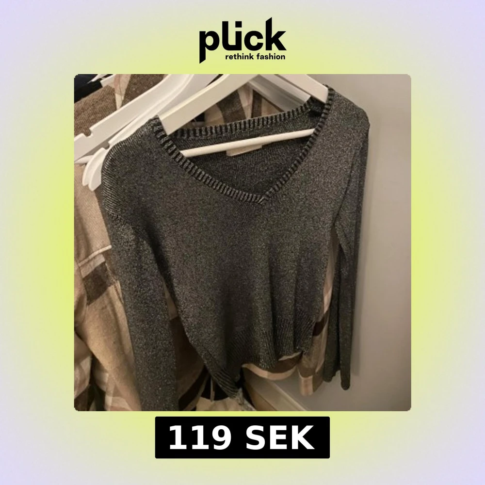 Snygg mörkgrå stickad tröja med glittriga detaljer och v-ringad hals. Tröjan har långa ärmar och ribbade muddar vid hals, ärmslut och nederkant. Perfekt för dig som vill ha lite extra shimmer i outfiten.
