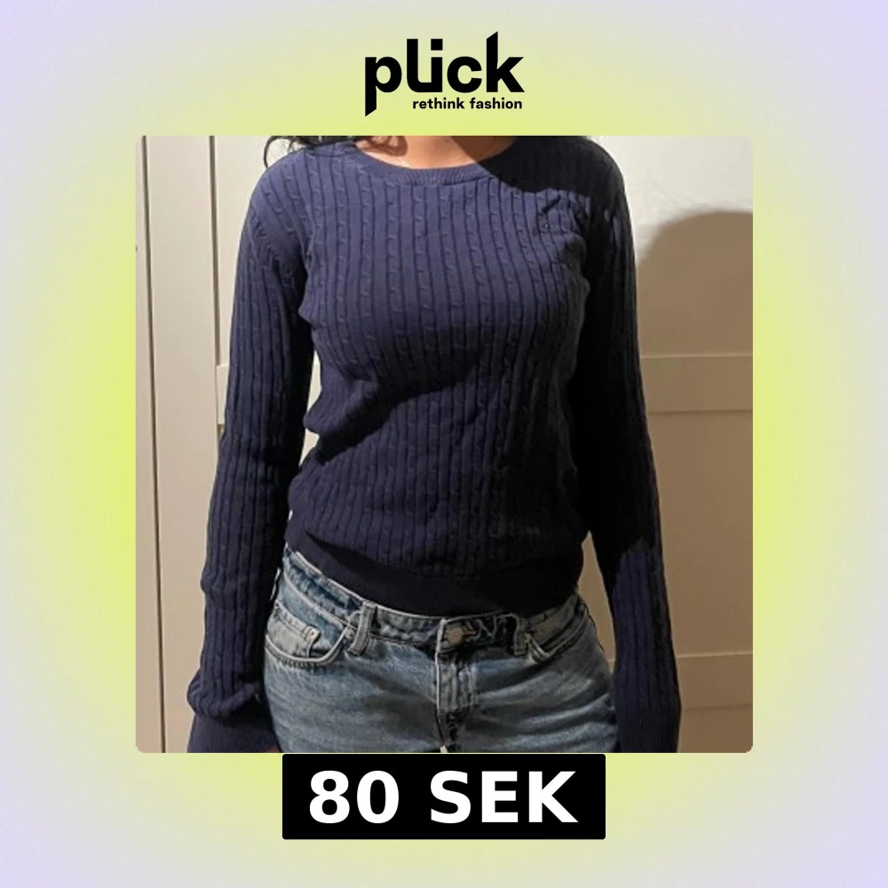 Mörkblå ribbstickad tröja med rund halsringning och långa ärmar. Tröjan har en klassisk, smal passform och är perfekt att matcha med jeans. Materialet känns mjukt och följsamt, vilket gör den både snygg och bekväm.