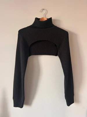 Svart ribbad croppad polotröja från Divided, H&M. Tröjan har lång ärm och hög polokrage, med öppen front som ger en edgy vibe. Perfekt att styla över en topp eller klänning för en cool layering-effekt.