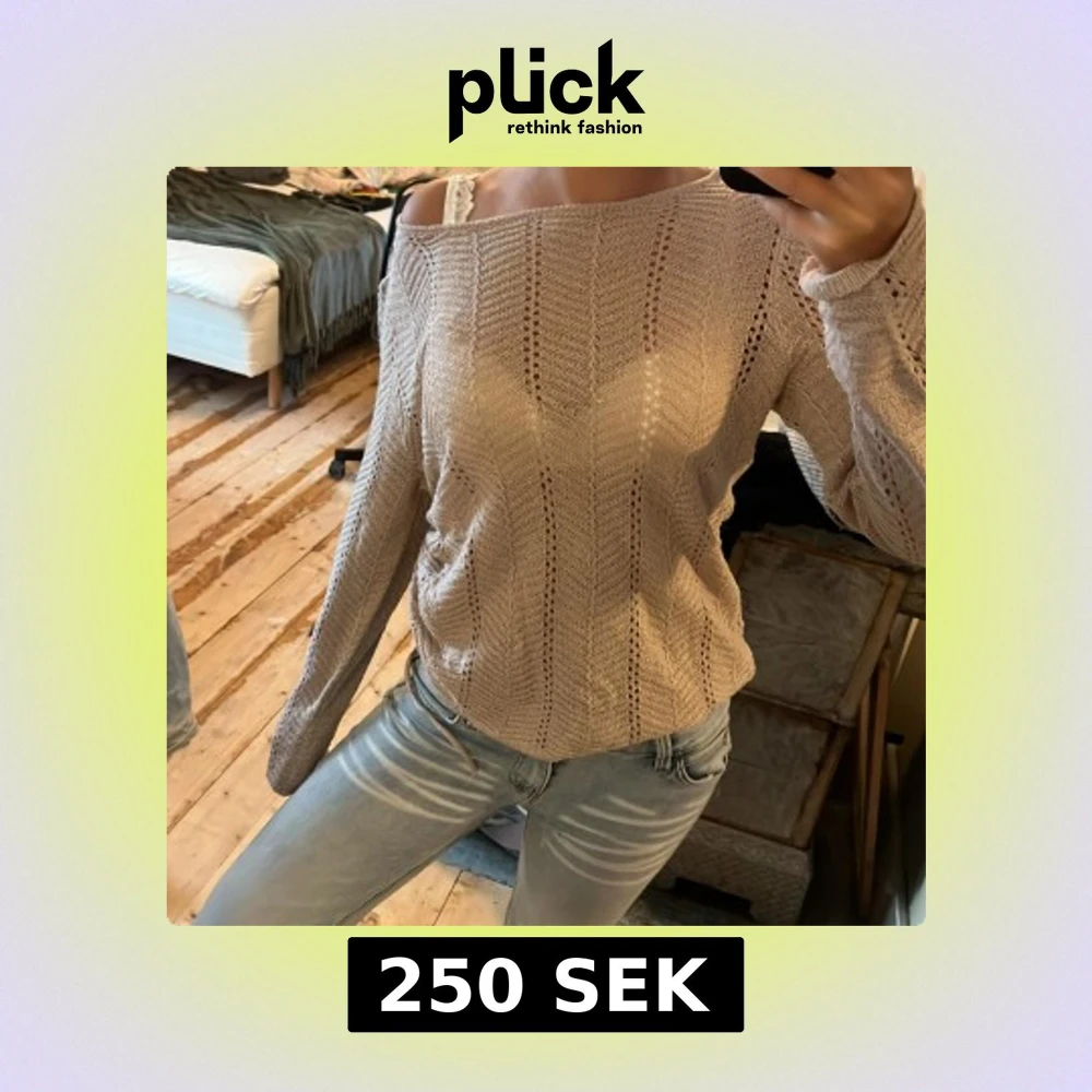 Säljer en beige stickad tröja. Tröjan har lång ärm, snyggt hålmönster och cool snörning på sidan som ger en unik look. Passar dig som gillar lite loose fit och offshoulder-stil. Går att stylea på jättemånga sätt💕