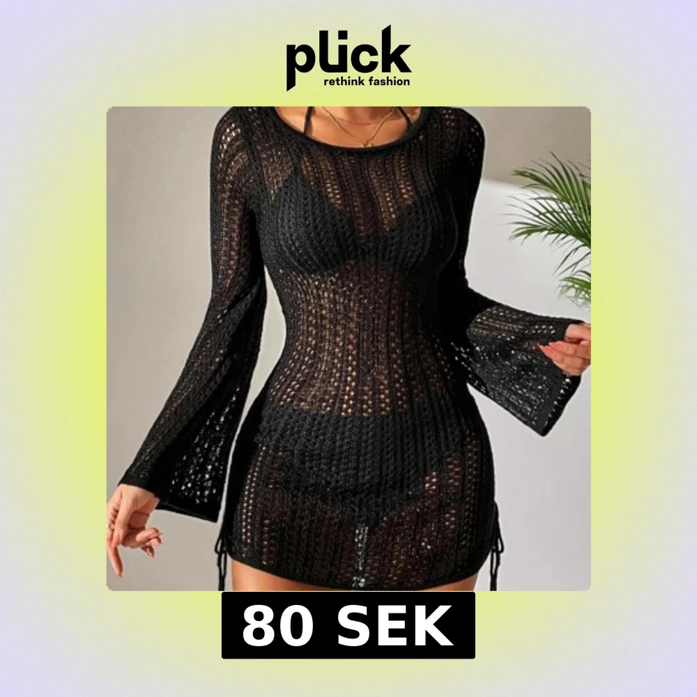 Snygg svart stickad kortklänning med långärmade utsvängda ärmar och transparent virkad look. Perfekt att dra över bikinin på stranden eller till sommarens häng. Figurnära passform och rund halsringning.