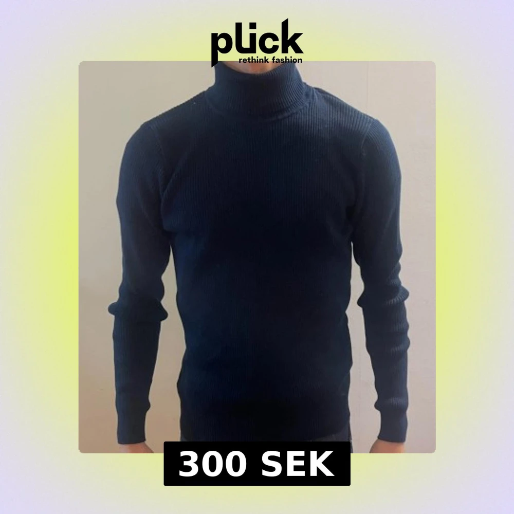 Säljer en mörkblå ribbad polotröja med lång ärm och hög krage. Tröjan har en slim passform och är tillverkad i ett mjukt, stickat material som sitter snyggt på kroppen. Perfekt för dig som gillar stilrena och klassiska plagg.