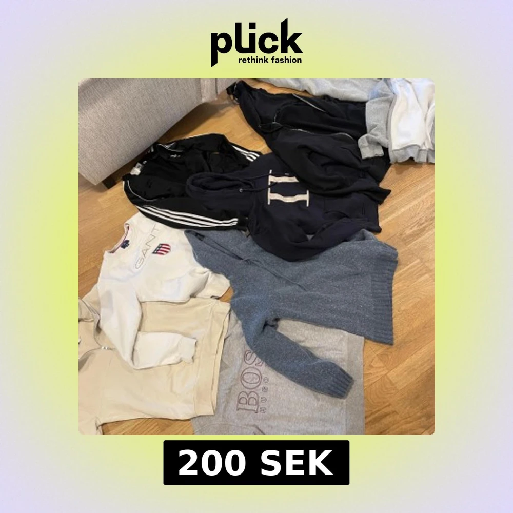 En samling av olika tröjor och hoodies från märken som GANT och Nike. Färgerna inkluderar svart, grå, beige och blå. Några av tröjorna har dragkedja och huva, medan andra är mer klassiska i designen. 200KR STYCK