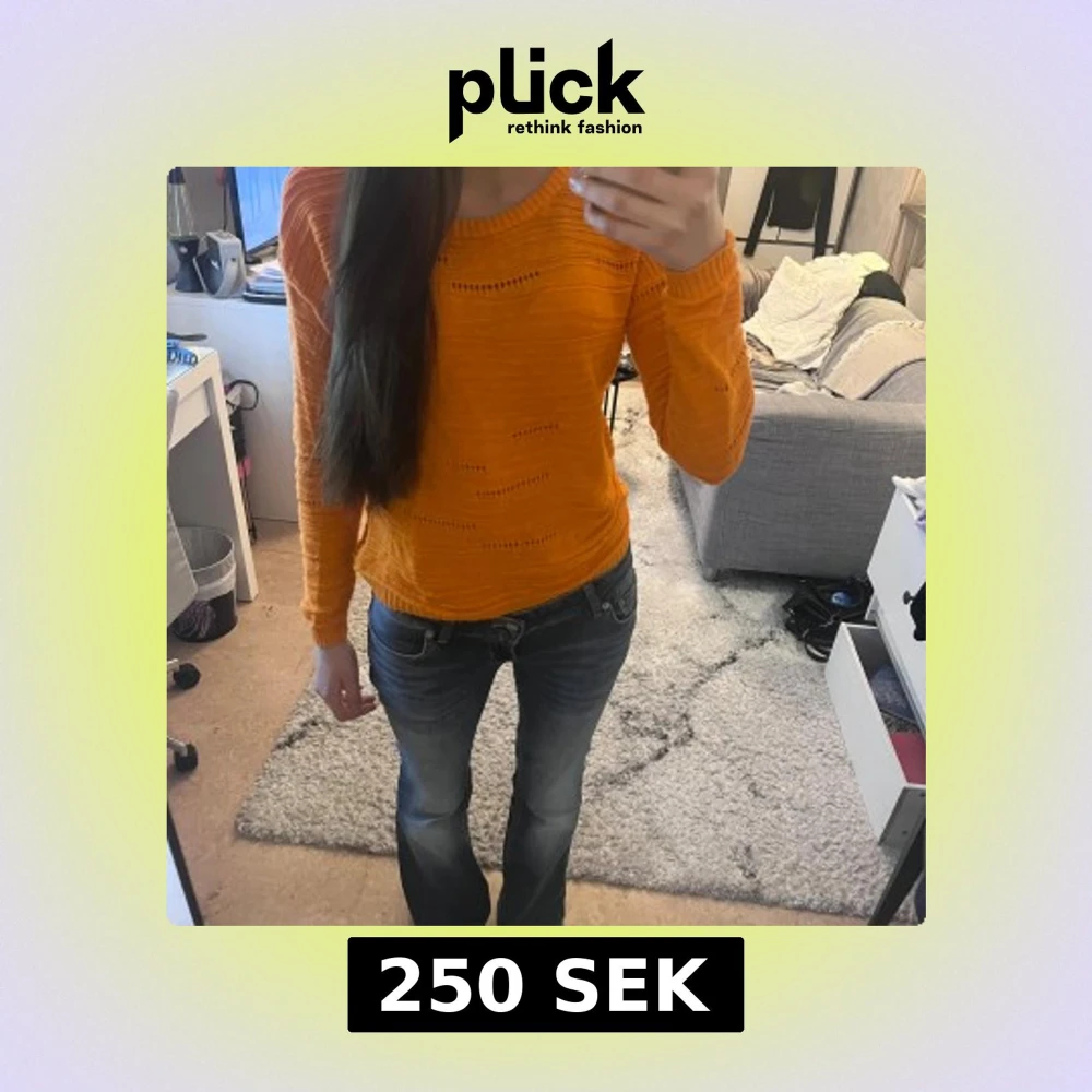 Säljer en snygg orange stickad tröja med hålmönster och rund hals. Tröjan har långärmade ärmar och en lätt loose passform. Perfekt för dig som gillar färg och vill ha något som sticker ut lite extra i garderoben.