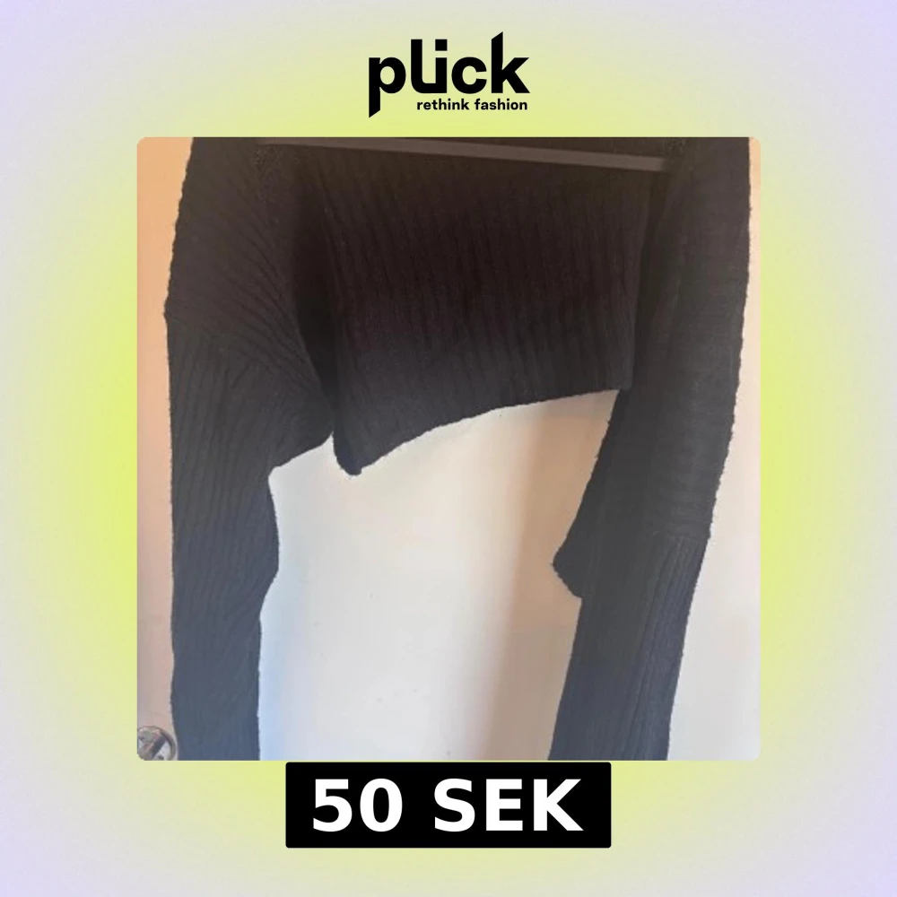 Säljer en svart croppad stickad tröja med ribbad struktur. Tröjan har långa ärmar och en loose passform, perfekt att styla med jeans eller kjol. Enkel och stilren design som funkar till många olika looks.
