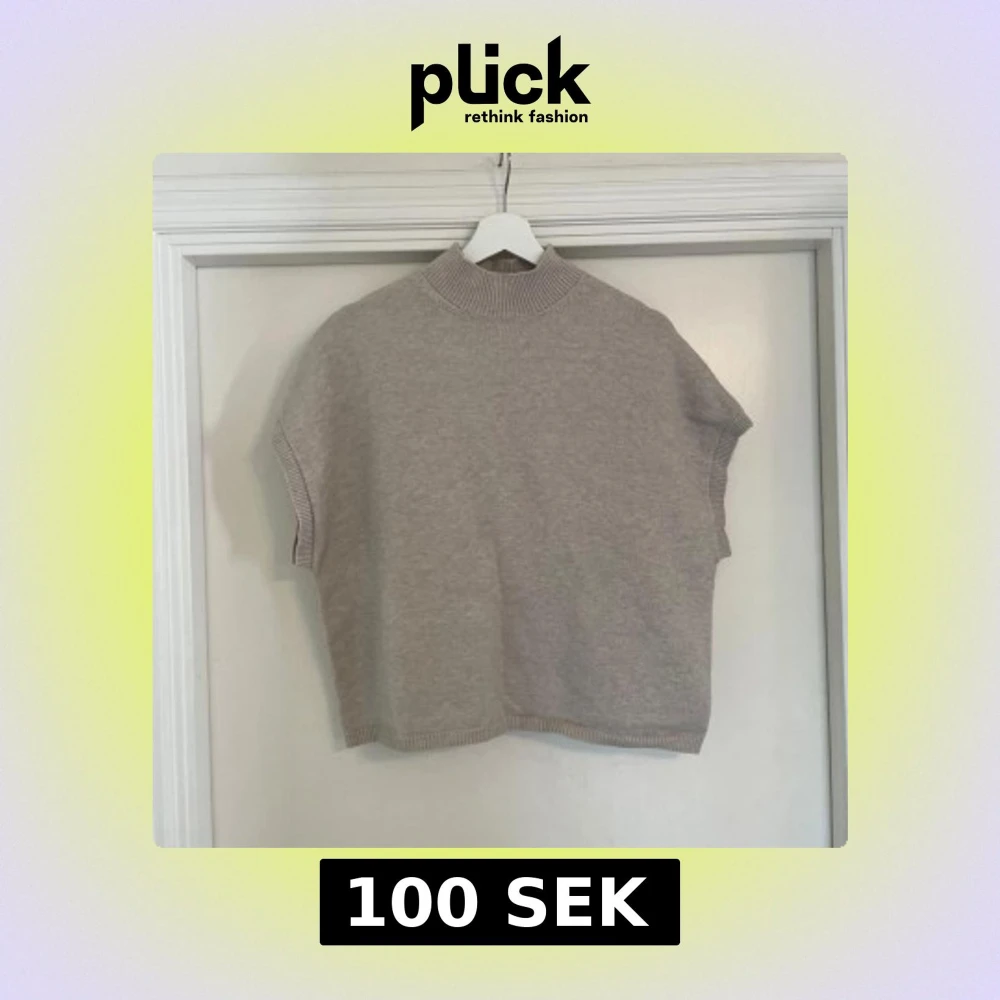 En stilren beige stickad väst med hög ribbad krage och breda ärmöppningar. Västen har en rak och loose passform, perfekt att slänga över en skjorta eller t-shirt. Ribbstickade detaljer vid krage, ärmöppningar och nederkant ger en snygg touch.