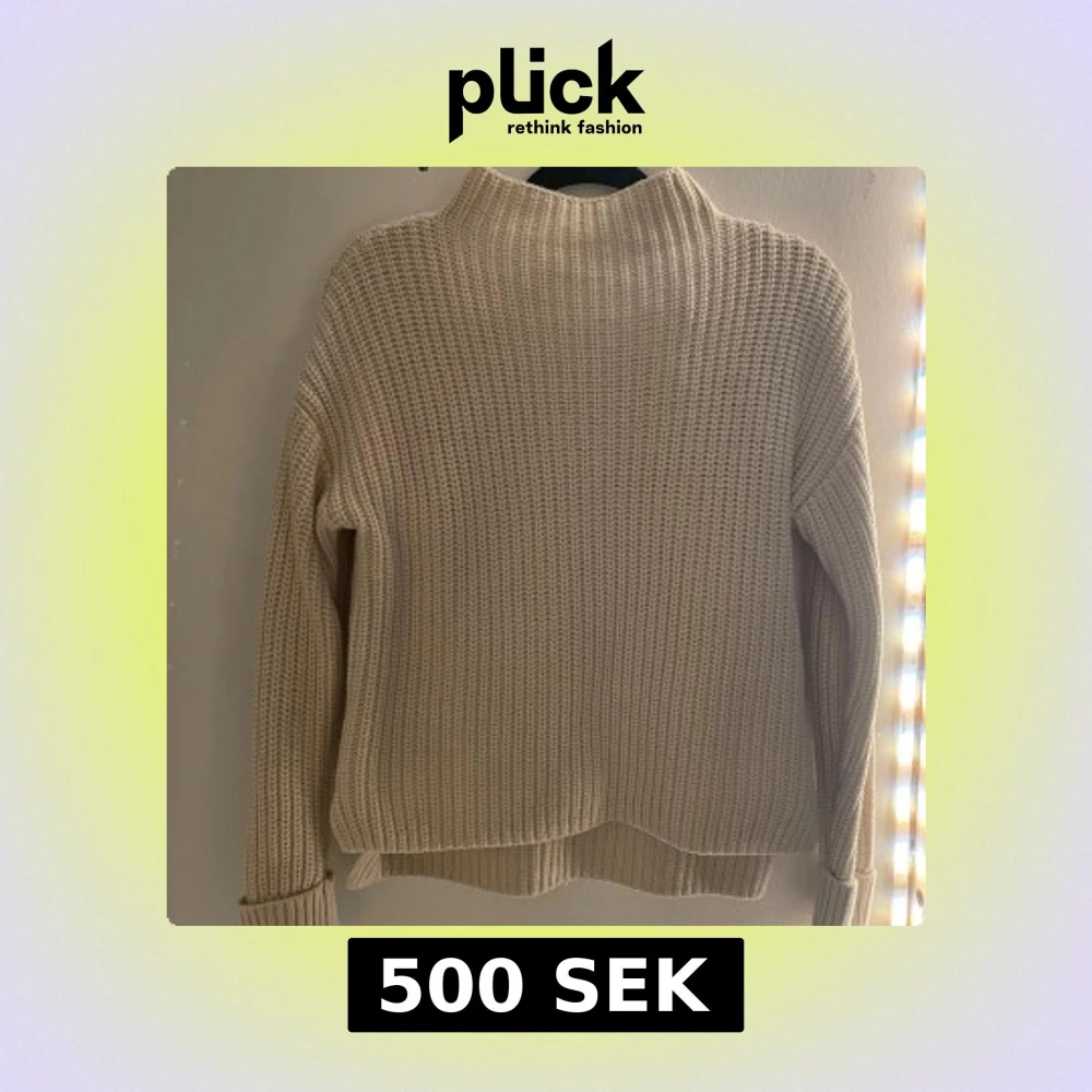 Säljer en mysig beige stickad tröja med hög krage. Tröjan har en ribbad struktur och långa ärmar, perfekt för kyliga dagar. Passar bra till både jeans och kjol.