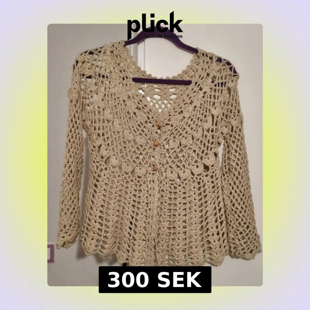 Superfin beige virkad kofta med v-ringning och träknappar framtill. Koftan har ett luftigt, blommigt mönster och långa ärmar. Perfekt att slänga över en topp för en bohemisk vibe. Handstickat tröja. Kan passa som S/M.