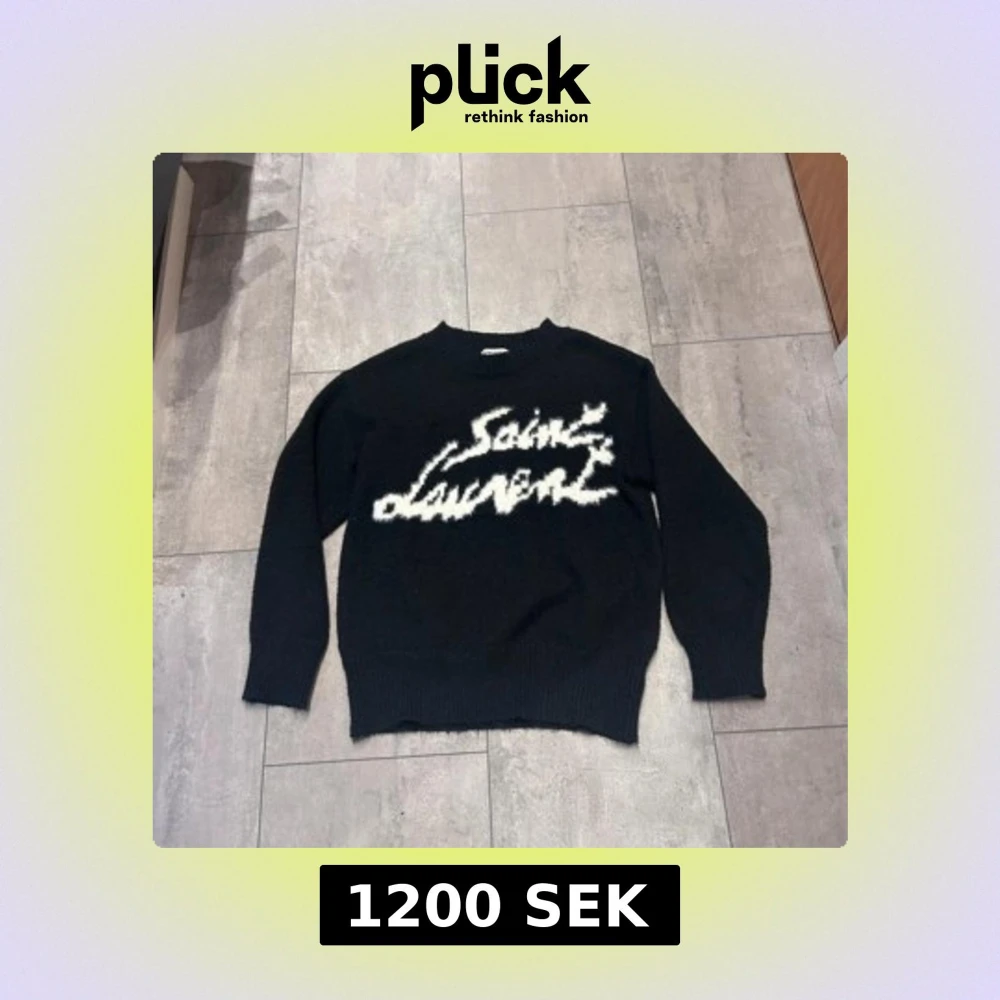 Svart stickad tröja från Saint Laurent med vit, stor logotyp framtill i graffiti-stil. Klassisk rund halsringning och ribbade muddar vid ärmslut och nederkant. Perfekt för dig som vill ha en statement piece från ett lyxigt märke.