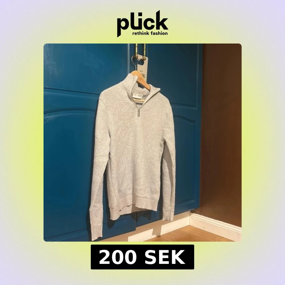 Säljer en ljusgrå stickad tröja från Selected Homme i storlek S. Tröjan har en ribbad krage med half zip-dragkedja och långa ärmar. Perfekt för lager-på-lager och enkel att matcha med det mesta.