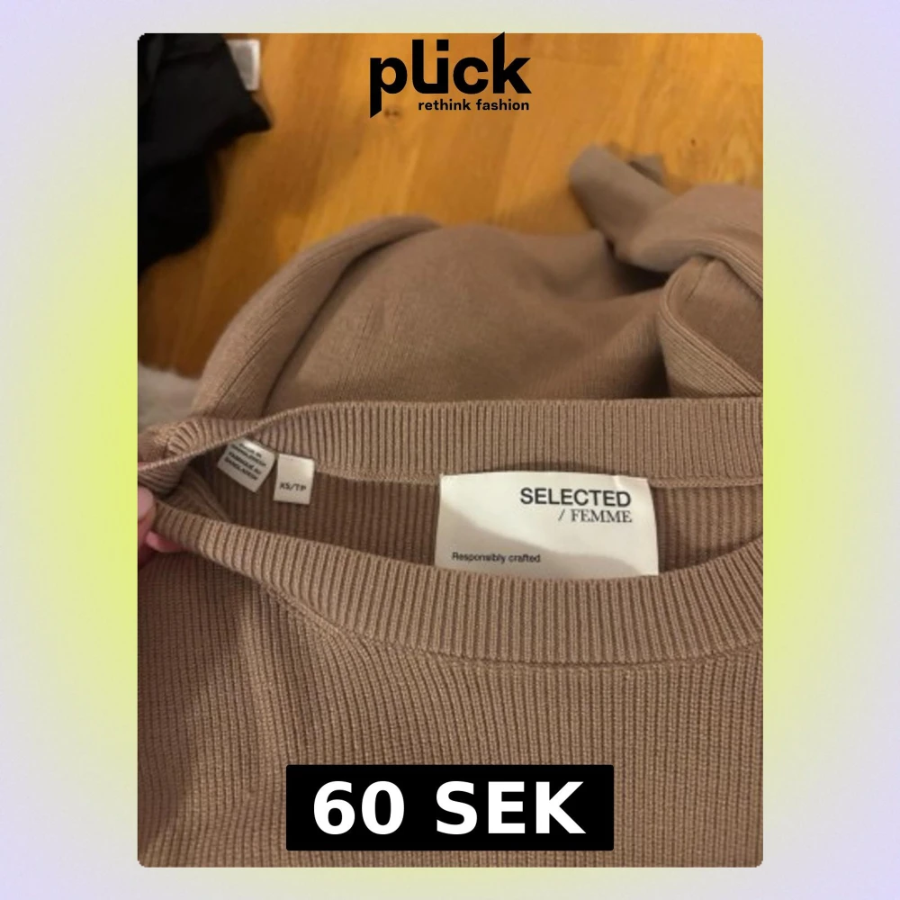 Säljer en beige stickad tröja från Selected Femme i storlek XS. Tröjan har rund halsringning, ribbade muddar och en relaxed passform. Perfekt att slänga på sig under kyligare dagar och enkel att styla med jeans eller kjol.