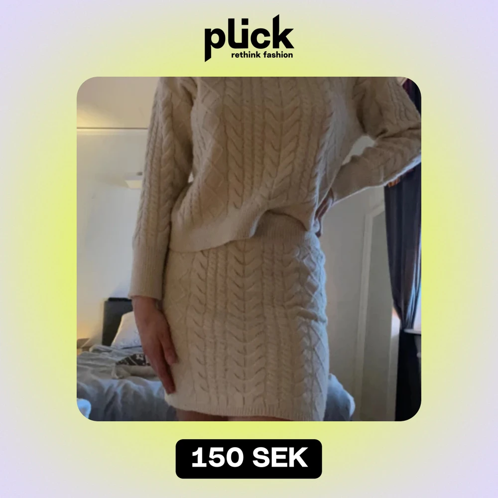 Stickat set bestående av tröja och kjol. Båda är i storlek 38 men skulle säga att de är ganska små i storlekarna. Har använts få gånger🤍