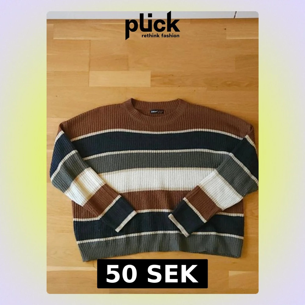 Stickad tröja från SHEIN med breda ränder i brunt, mörkgrönt, beige, vitt och mörkblått. Tröjan har rund halsringning, lång ärm och grov ribbstickning. Perfekt för dig som gillar retrovibbar och mysiga höstlooks.