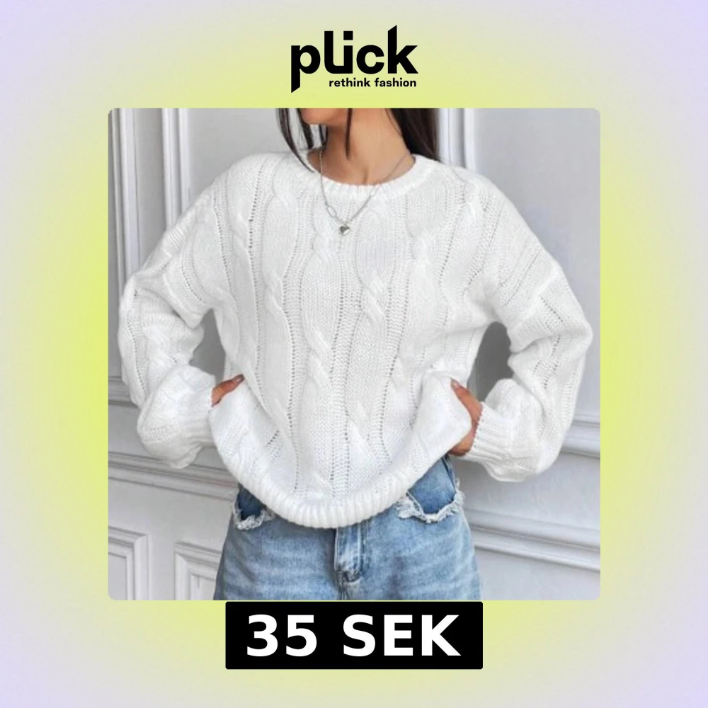 Storlek L liten i storlek. Säljer en vit kabelstickad tröja med rund hals och långa ärmar. Tröjan har en chunky känsla och breda muddar vid ärmslut och nederkant. Perfekt för lager-på-lager och ger en clean, fräsch look till jeans eller kjol.