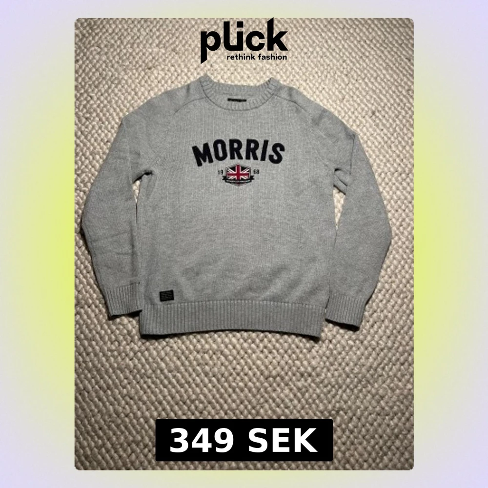 Snygg grå stickad tröja från Morris i storlek S. Tröjan har broderad Morris-logga och ett Union Jack-emblem framtill. Rund hals och ribbade muddar vid ärmslut och nederkant. Perfekt för dig som gillar klassisk stil med en modern twist.