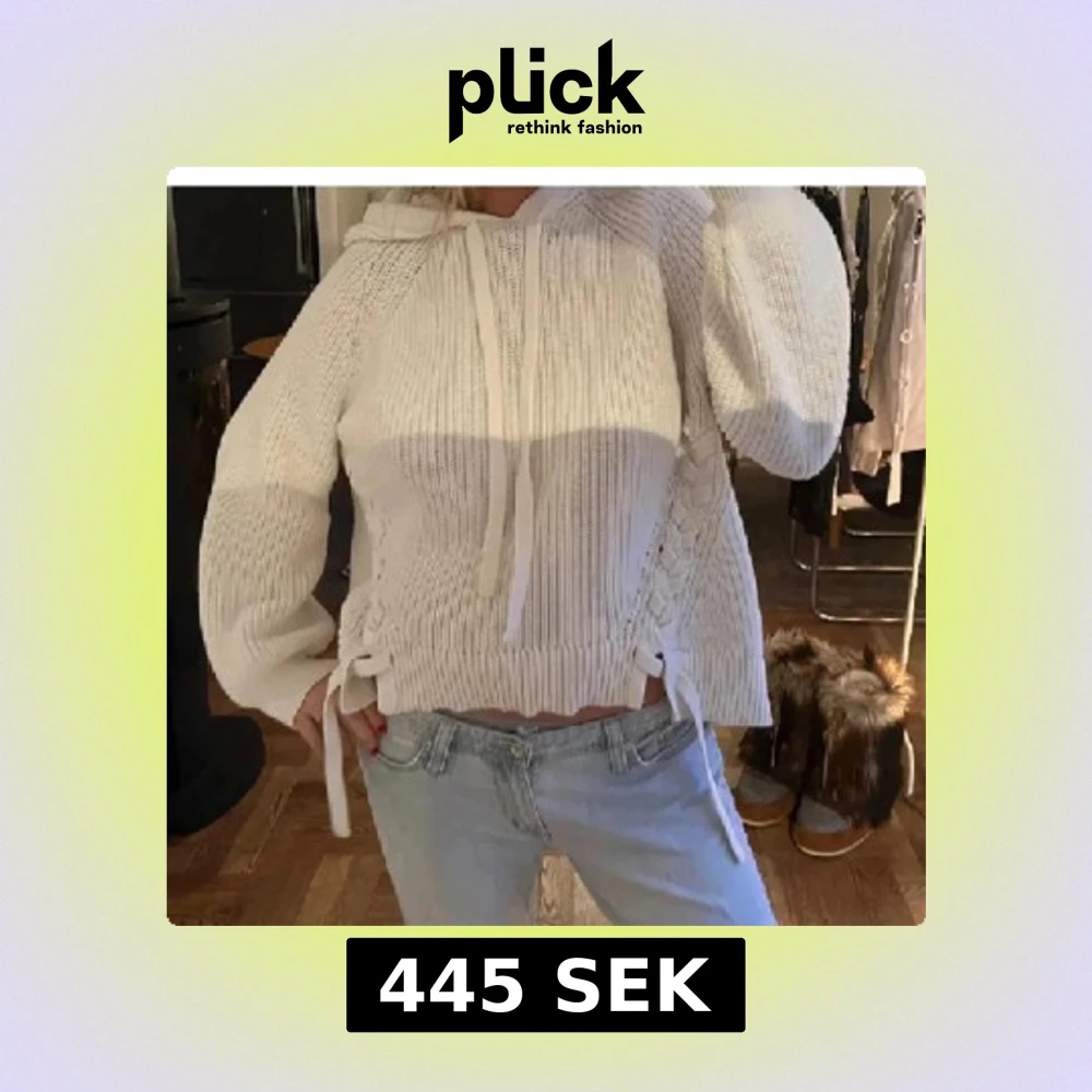 Säljer en vit stickad hoodie med huva och snörning i sidorna. Tröjan har långa ärmar, ribbade muddar och en croppad passform. Perfekt för dig som gillar en avslappnad men ändå trendig stil.