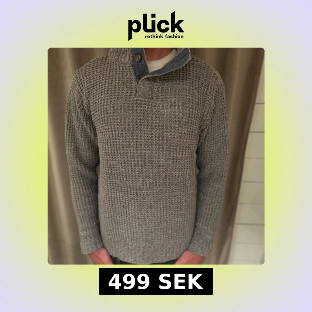 Tjena, Säljer en stilren grå stickad tröja med hög krage och knappdetalj. Perfekt för kyliga dagar med sin mysiga och varma design. Tröjan har långa ärmar och en texturerad yta som ger en extra touch av stil.