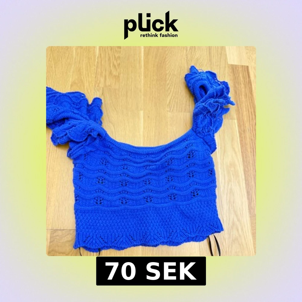 Säljer en blå stickad croppad topp med volangärmar och vågigt mönster. Toppen har en fyrkantig ringning och dekorativa detaljer i stickningen. Perfekt för att lyfta din outfit!