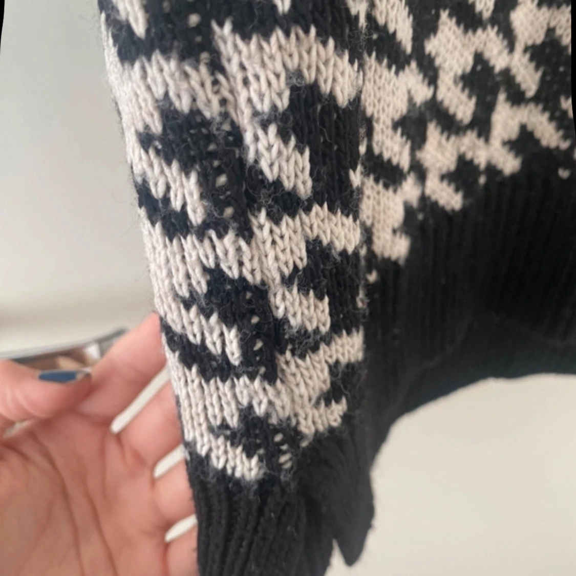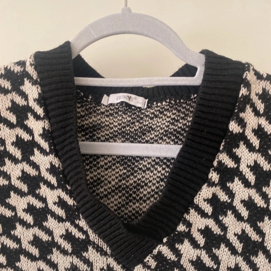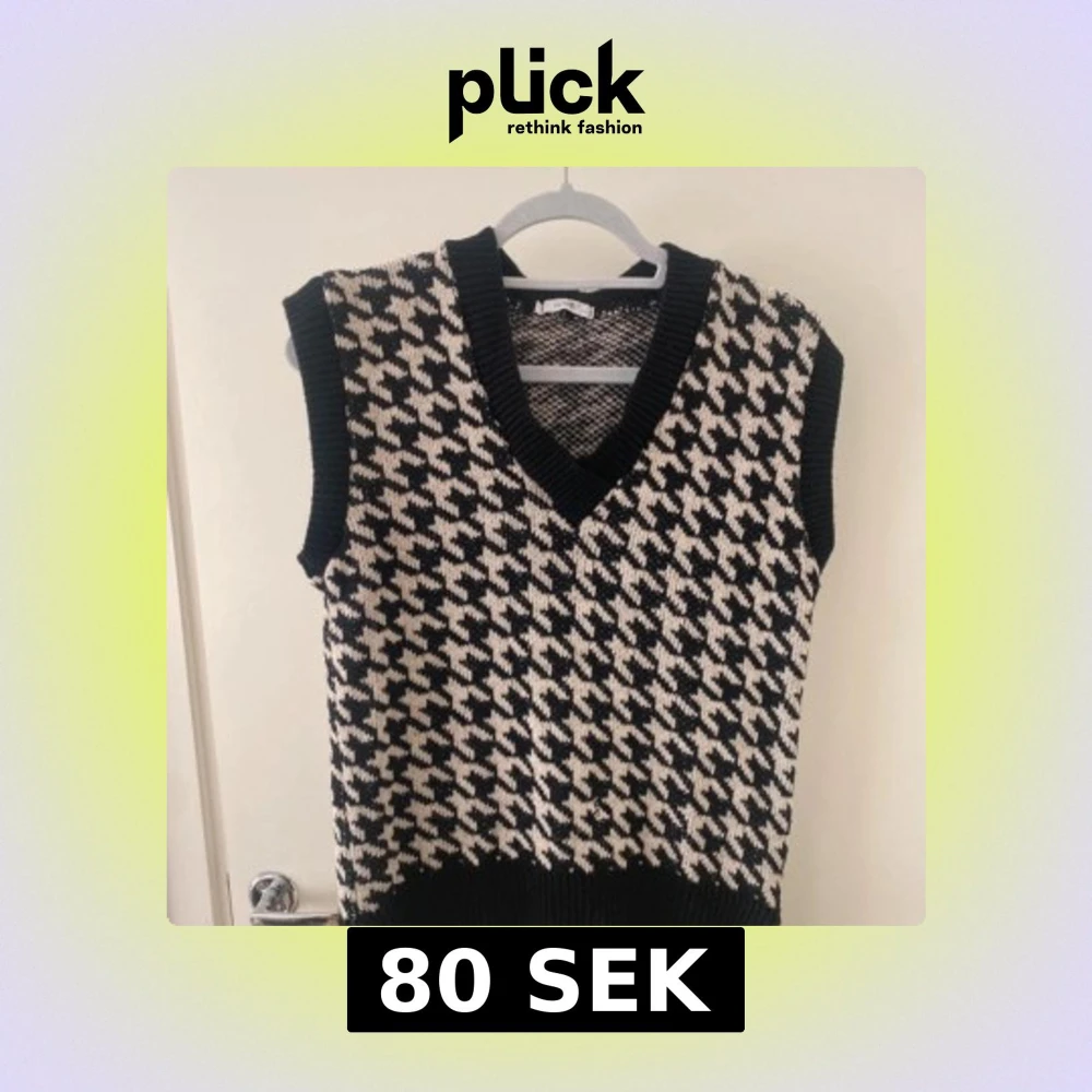 Snygg stickad väst i svart och vitt mönster och V-ringad och ribbade kanter vid hals, ärmhål och nederkant. Perfekt att styla över en skjorta eller t-shirt.